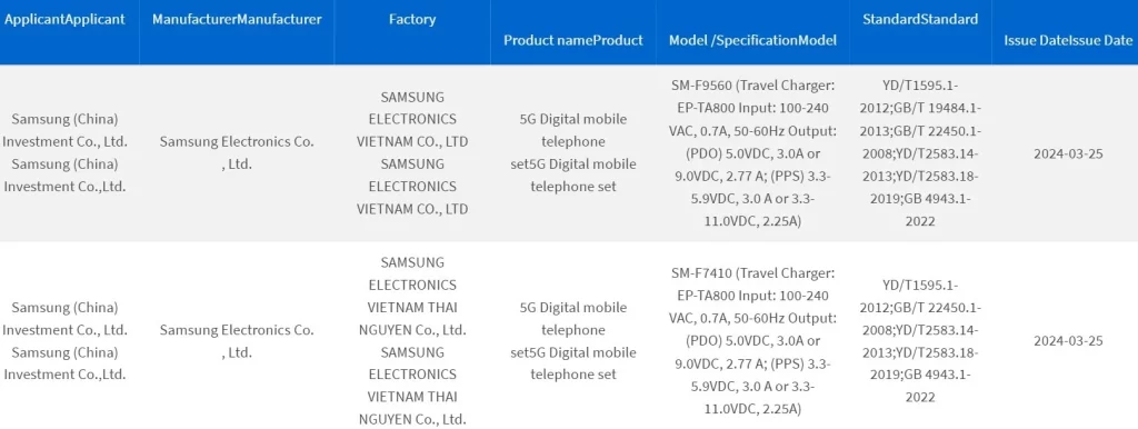 The Samsung Galaxy Z Flip 6 is listed with model number SM-F9560 whereas the Z Fold 6 has SM-F7410 model number on the 3C certification platform. As per the regulatory listing, these phones will support Samsung’s charger with model number EP-TA800. It does not explicitly reveal the charging speed but going by the charger’s model number, it will max out at 25W.