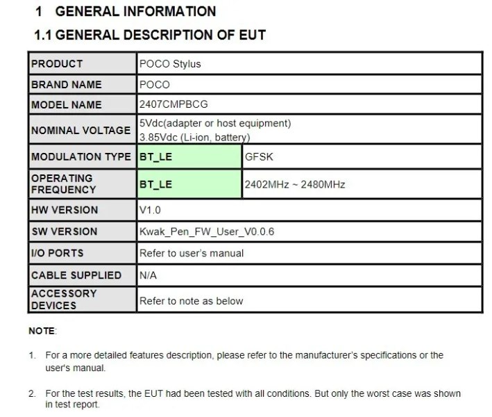 The Poco Stylus has a design reminiscent of popular styluses like the Apple Pencil. According to the listing, it will operate within the 2402-2480MHz frequency range and is expected to run software version Kwak_Pen_FW_User_V0.0.6.