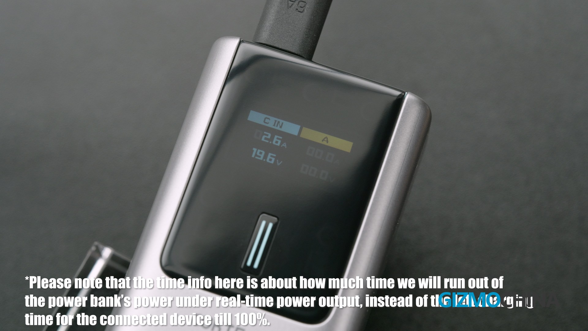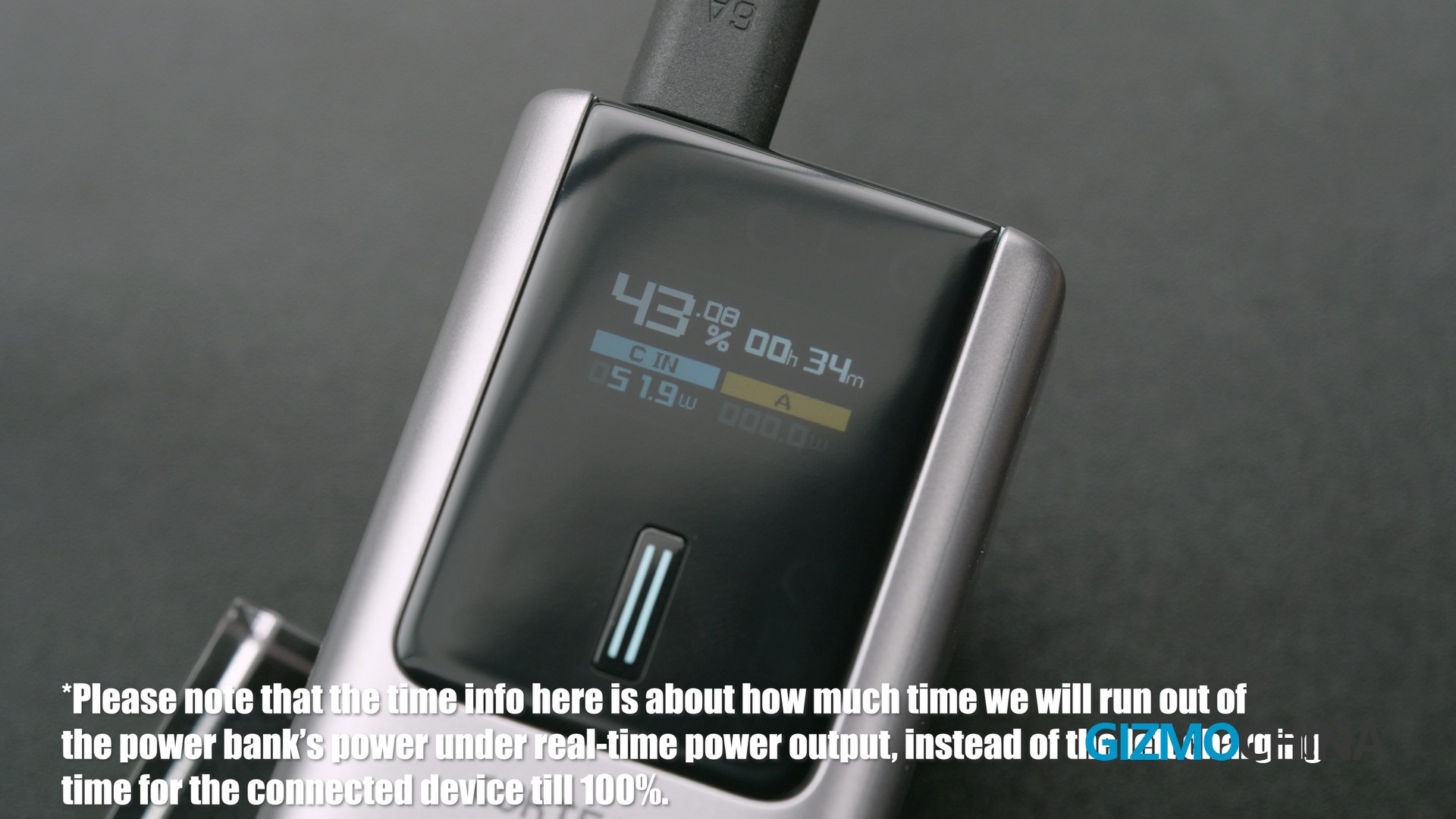 There is a small TFT screen on the front of the power bank, which can display the remaining power, charge, or discharge time left, as well as the working status of each port.