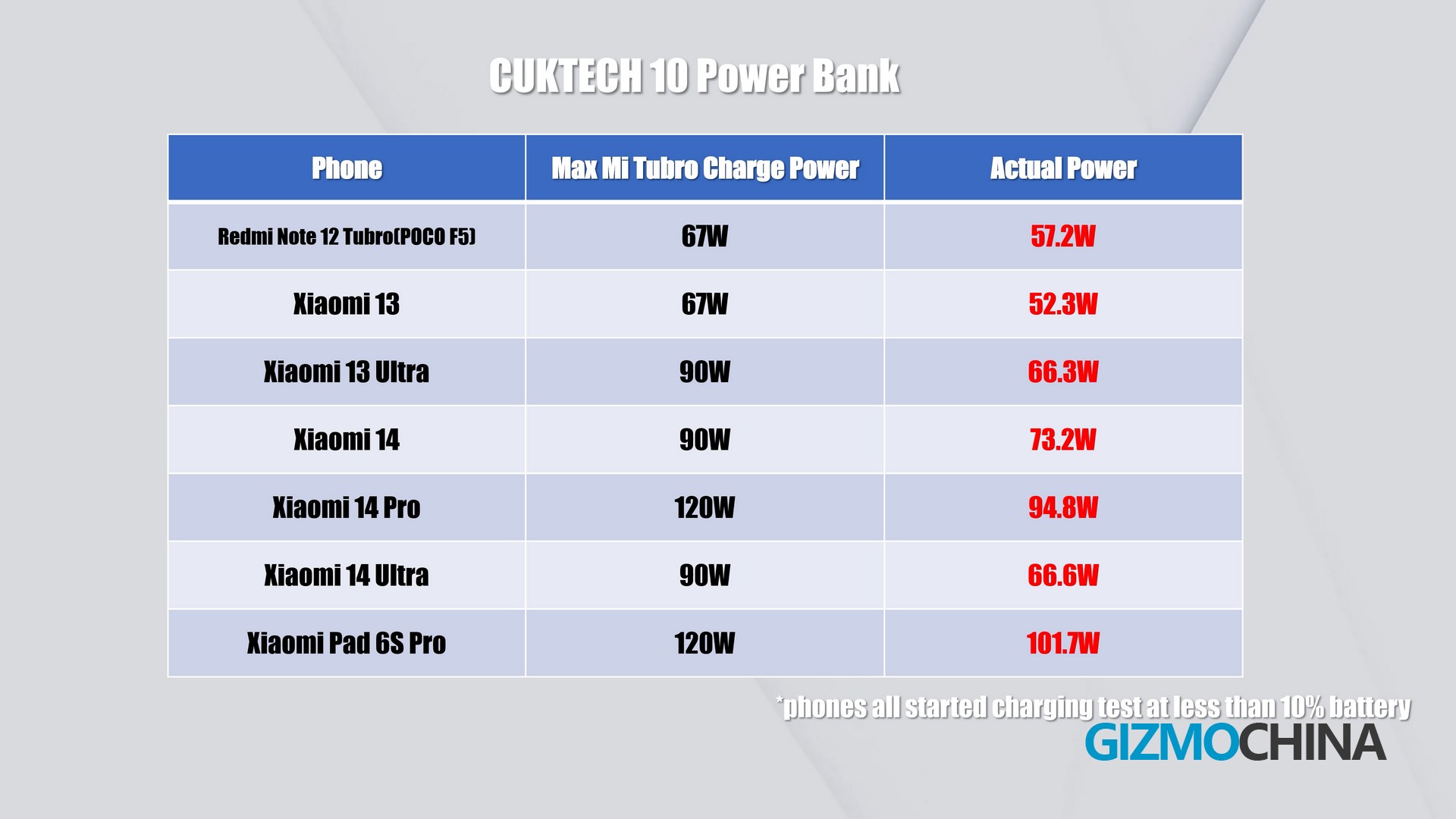 Of course, the most important thing is how it performs when charging up Xiaomi devices, I chose several popular Xiaomi devices to test and there is no doubt that the CUKTECH 10 Power Bank can activate the highest power Tubro charge for all of them, which is almost the same as we got on the premium CUKTECH 20.