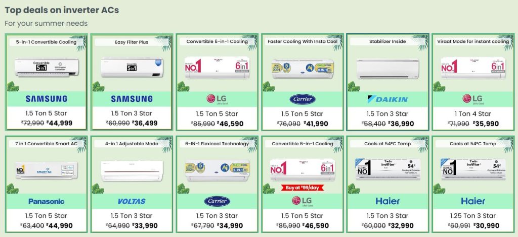 For Residential use, there’s a great demand for Inverter ACs and the price for the same starts from Rs 25,990 on Amazon. Interested folks grab Samsung, Daikin, Voltas, Llyod, and Carrier ACs at some exciting prices. Some extra discounts are applicable on the last year’s AC models.