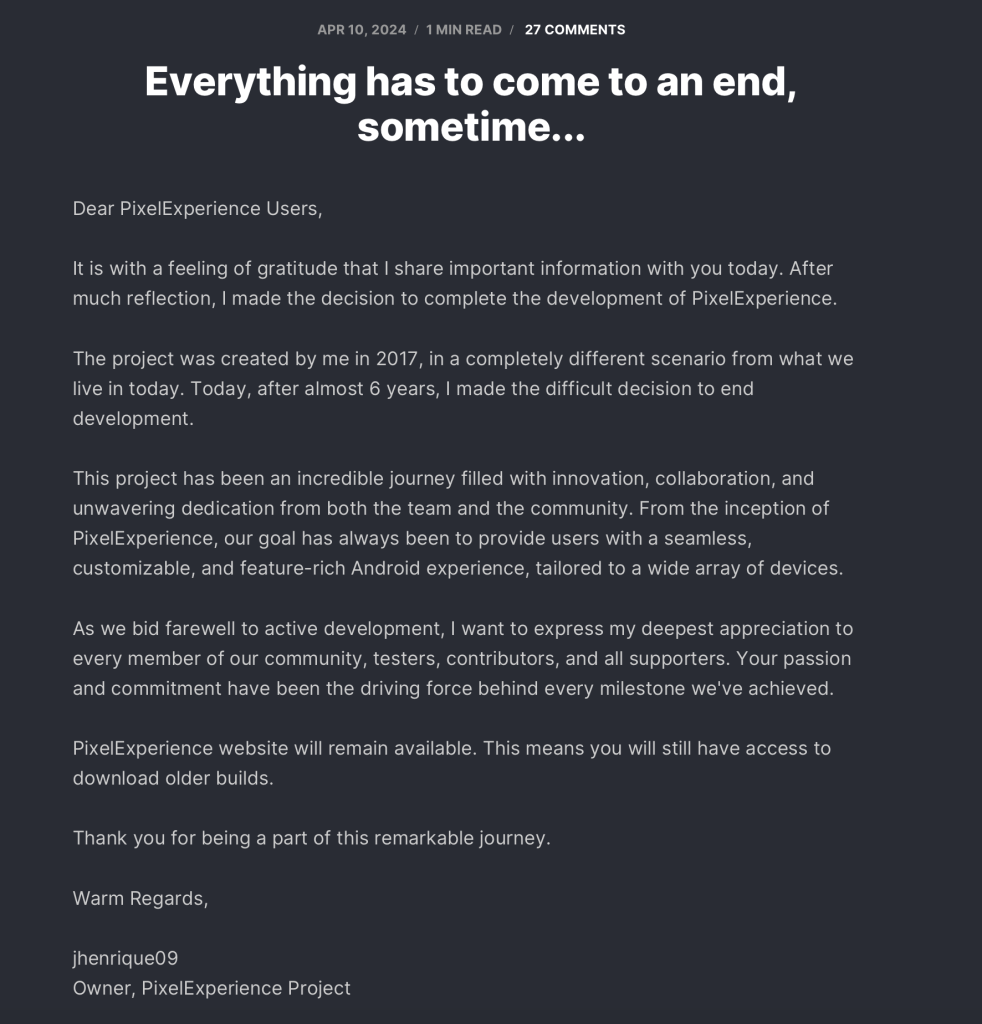 Henrique Silva, the owner of the Pixel Experience project, made an announcement on his website, stating, “Everything has to come to an end, sometime…” The Pixel Experience project is officially coming to a close.