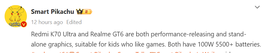 According to tipster Smart Pikachu, the Redmi K70 Ultra and the Realme GT 6 will debut soon in China. Both are performance-driven sub-flagship phones equipped with an independent graphics chip, making them ideal for those who prefer gaming. The leak states that the Redmi K70 Ultra and Realme GT 6 will come equipped with a battery of around 5,500mAh and support 100W fast charging.