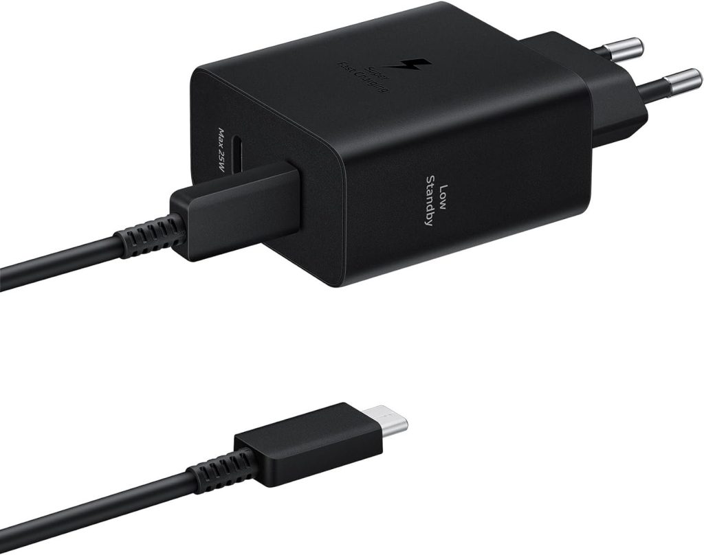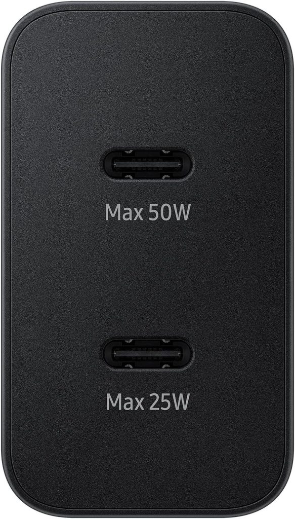 Samsung’s new “50W PD Duo” charging adapter priced at €69.60 in Europe, comes with a 5A USB C cable in the box. This charger, with two ports, can deliver a maximum power of 50W when one port is plugged in, and can charge two devices simultaneously, with each port delivering a maximum of 25W. Additionally, the charger is only available in black color.