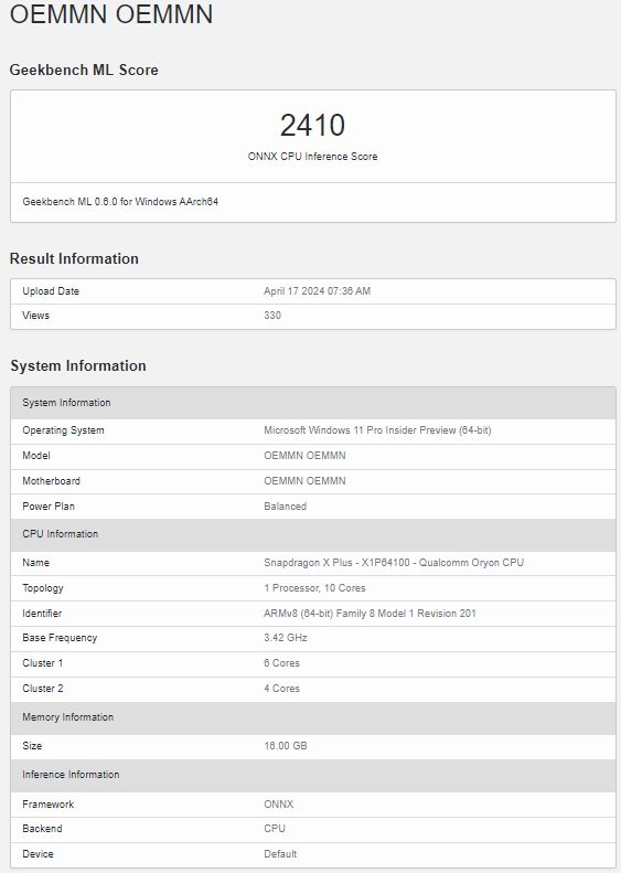 Speaking of the new “X Plus” chip, it is powered by 10 Oryon CPU cores, 6 of which are performance cores and the rest of the 4 cores focus on power efficiency. The GeekBench listing shows that the base frequency is 3.42GHz. In comparison, the “X Elite” chipset equips a total of 12 uniform Oryon CPU cores. However, while 10 of them run at a clock speed of 3.8 GHz (which is higher than that of the “X Plus” chip), two cores reach up to 4.3 GHz.