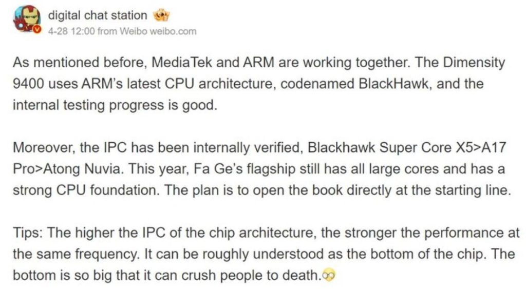 DCS confirms earlier leaks that MediaTek and ARM are working closely to develop the next-generation Dimensity 9400. This chip will reportedly use ARM’s newest CPU architecture which is codenamed “BlackHawk.”