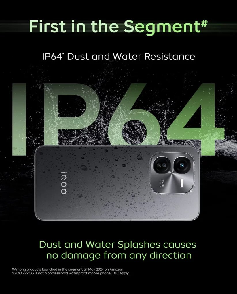 The iQOO Z9x will be the first phone in its class to be dust and water-resistant, with an IP64 rating. That means it can take on splashes and dusty environments without a problem.