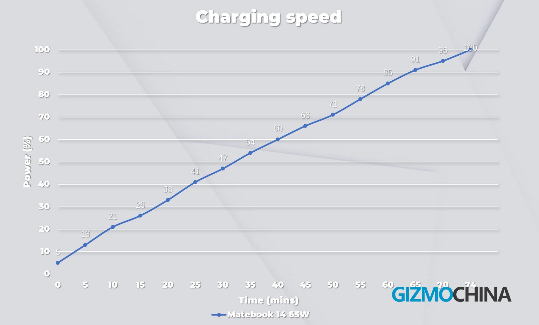 The Matebook 14 comes with a 65W charger as standard, and it took about 75 minutes to go from 5% to a fully charged battery with the official charger. I also tested it with a PD3.1 140W charger with a maximum input of 94W, so it could be a bit faster if you use a high-power charger.
