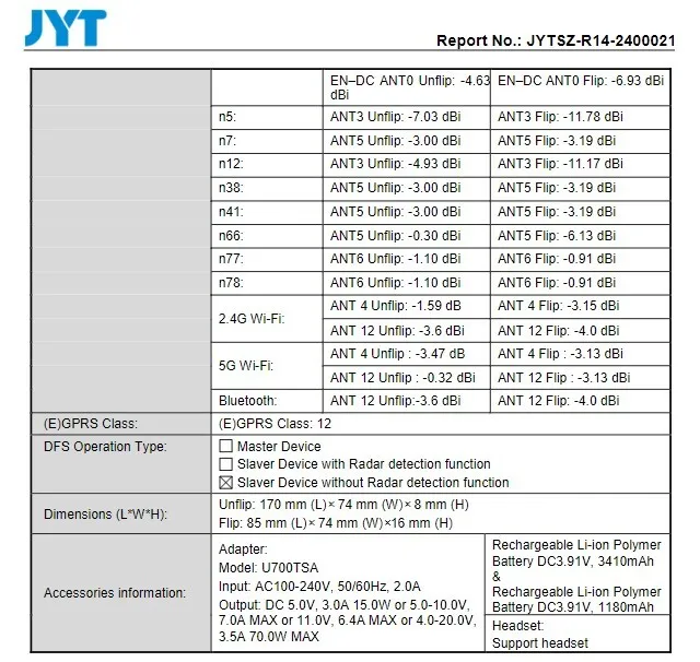 The FCC listing also mentions that the Tecno Phantom V2 Flip will be powered by dual-cell batteries with capacities of 3,410mAh and 1,180mAh. This means that the phone will have a 4,590mAh cell onboard. It is 15 percent bigger than its predecessor. The clamshell foldable phone is said to support 70W fast charging. It is listed with 8GB RAM and 256GB storage.
