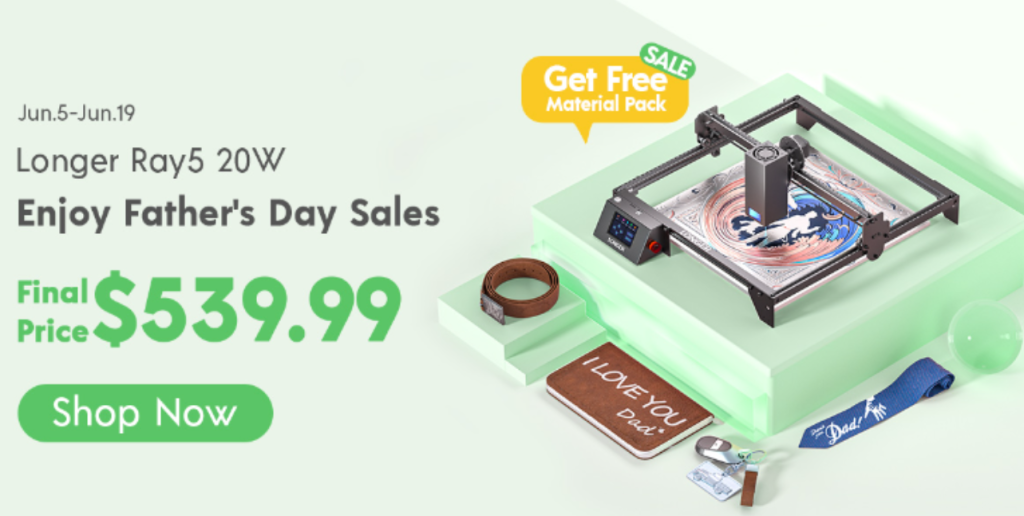 From June 5th to June 19th, 2024, LONGER is offering an exclusive Father’s Day sale. During this period, you can save up to $1020 on your purchase, with the LONGER Ray5 20W Pro Max Set available at a 45% discount. This makes it the best laser engraver deal of the season and an opportunity not to be missed.