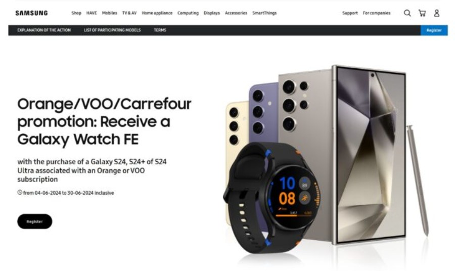 The wearable was spotted on an intriguing promo offer in Belgium where users can get a free Galaxy Watch FE when they buy a Galaxy S24, S24+, or S24 Ultra with a subscription plan from Orange or VOO before June 30. This is somewhat surprising as Samsung hasn’t officially announced the Galaxy Watch FE yet.