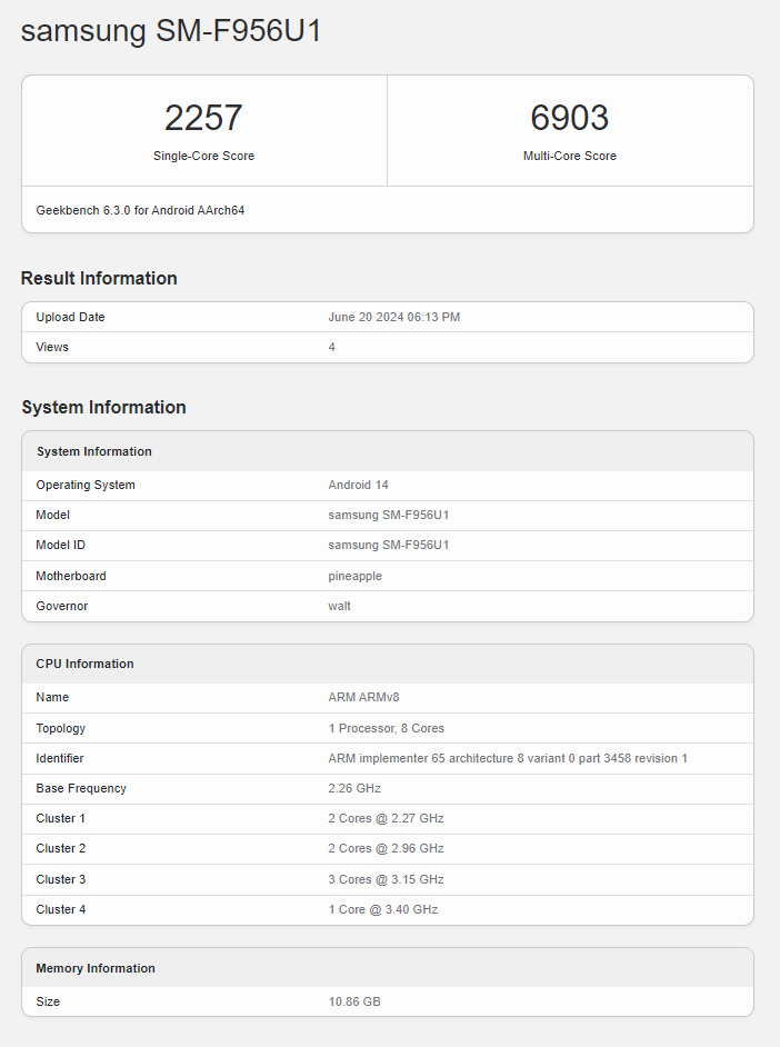 The device, identified by the model number SM-F956U1, achieved scores of 2,257 in single-core and 6,903 in multi-core tests on Geekbench. As mentioned above, this version is carrier-unlocked, providing flexibility with any carrier. Previously, a carrier-locked version (SM-F956U) was also spotted.