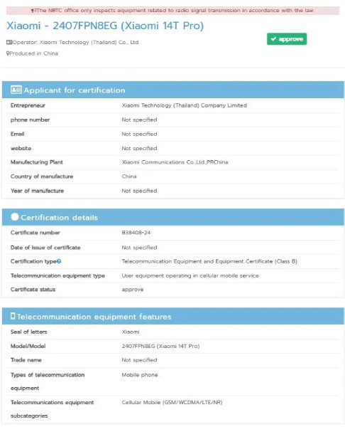 The NBTC certification confirms the model number (2407FPN8EG) and the phone’s moniker – Xiaomi 14T Pro. It also reveals support for GSM, WCDMA, LTE, and NR connectivity.