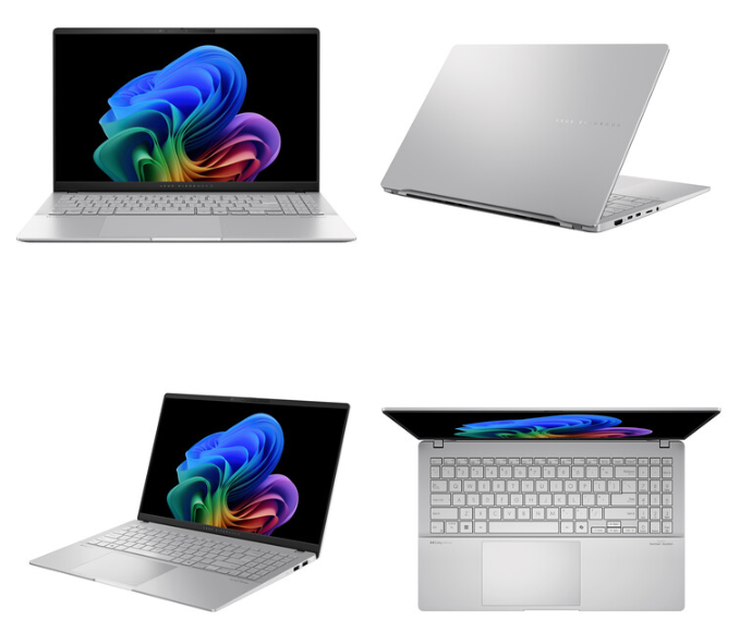 The ASUS Vivobook S 15 (S5507) is powered by the Qualcomm Snapdragon X Elite X1E 78 100 processor, paired with 32GB LPDDR5X RAM and a 1TB M.2 NVMe PCIe 4.0 SSD. The device runs on Windows 11 Home. It has a 15.6-inch ASUS Lumina OLED display with a 3k resolution, a 120Hz refresh rate, 600 nits peak brightness, 100% DCI-P3 color gamut, and a 16:9 aspect ratio.