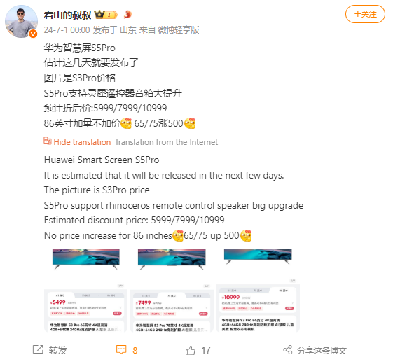 The latest news comes from Weibo tipster (Chinese microblogging site) 看山的叔叔. The tipster claims that the pricing will be similar to the previous Vision S3 Pro. According to him, the estimated pricing of the 65″ 75″ and 86″ options could be 5999 Yuan / 7999 Yuan / 10999 Yuan after a discount. While the first two are priced 500 Yuan more than the Vision S3 Pro, the 86″ option will cost the same.