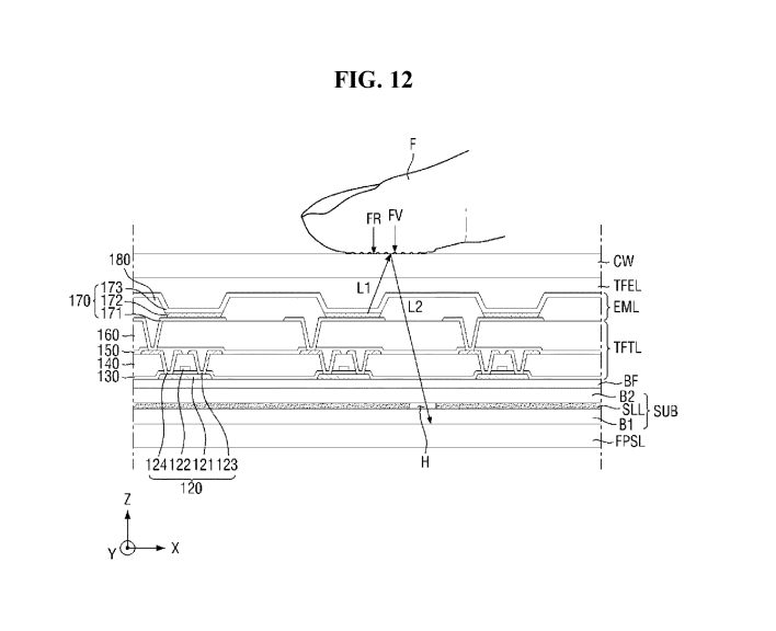 So the company’s goal is to develop a display that can implement a fingerprint recognition sensor without a separate external light source. Reportedly, it will also provide improved fingerprint recognition characteristics. In the attached feature the thickness of the layers and regions may be exaggerated for clarity.