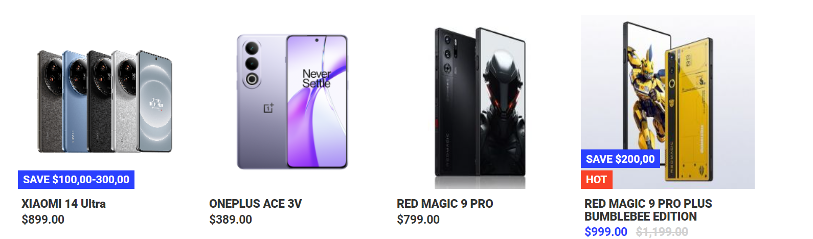 - Xiaomi 14 Ultra: Originally priced at $899.00, with savings ranging from $100.00 to $300.00, and a rating of 100%.