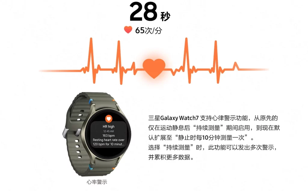 Galaxy Watch 7 offers health tracking features such as heart rate warning, ECG, body composition measurement, menstrual cycle tracking, and fall detection.