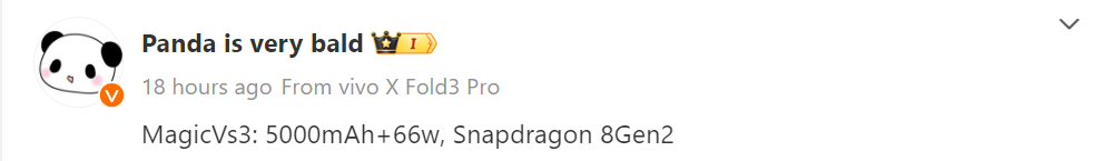 According to tipster Panda is Bald, the Honor Magic Vs3 will feature the Snapdragon 8 Gen 2 chipset and it will pack a 5,000mAh battery. It will support the 66W fast charging. However, it appears that the device may lack support for wireless charging.