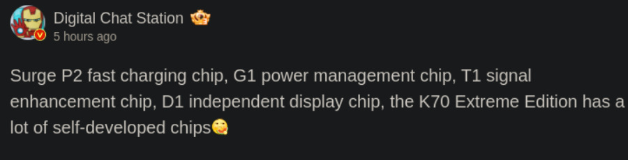 According to the leak, the K70 Ultra will reportedly pack four in-house chips alongside the MediaTek Dimensity 9300+ processor. This includes the Surge P2 for fast charging, the G1 for power management, the T1 for signal enhancement, and the D1 for independent display processing.