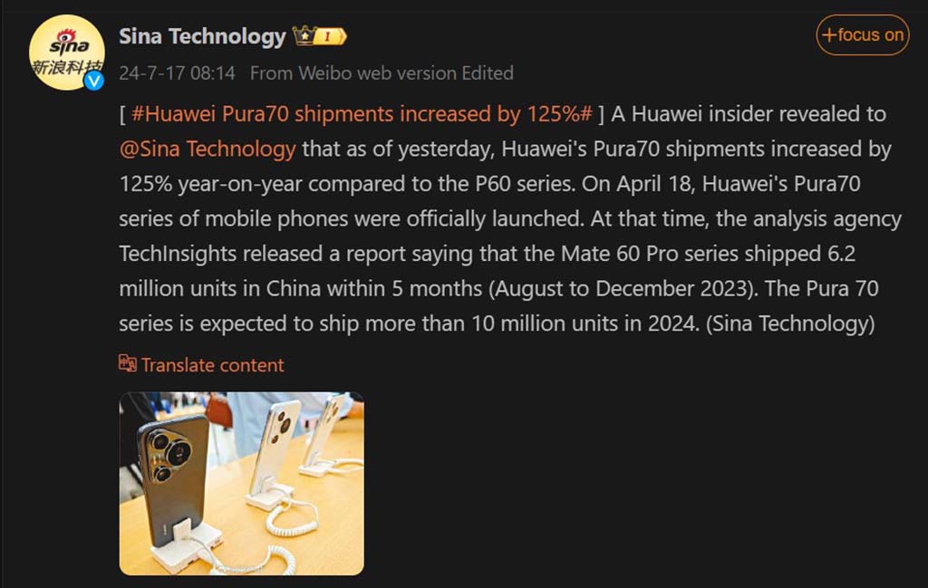 Huawei launched the Pura 70 series in April this year with a new Kirin chipset. In the latest news, a Huawei insider claimed that the shipment volume of the series increased by 125% year-on-year compared to the P60 series.