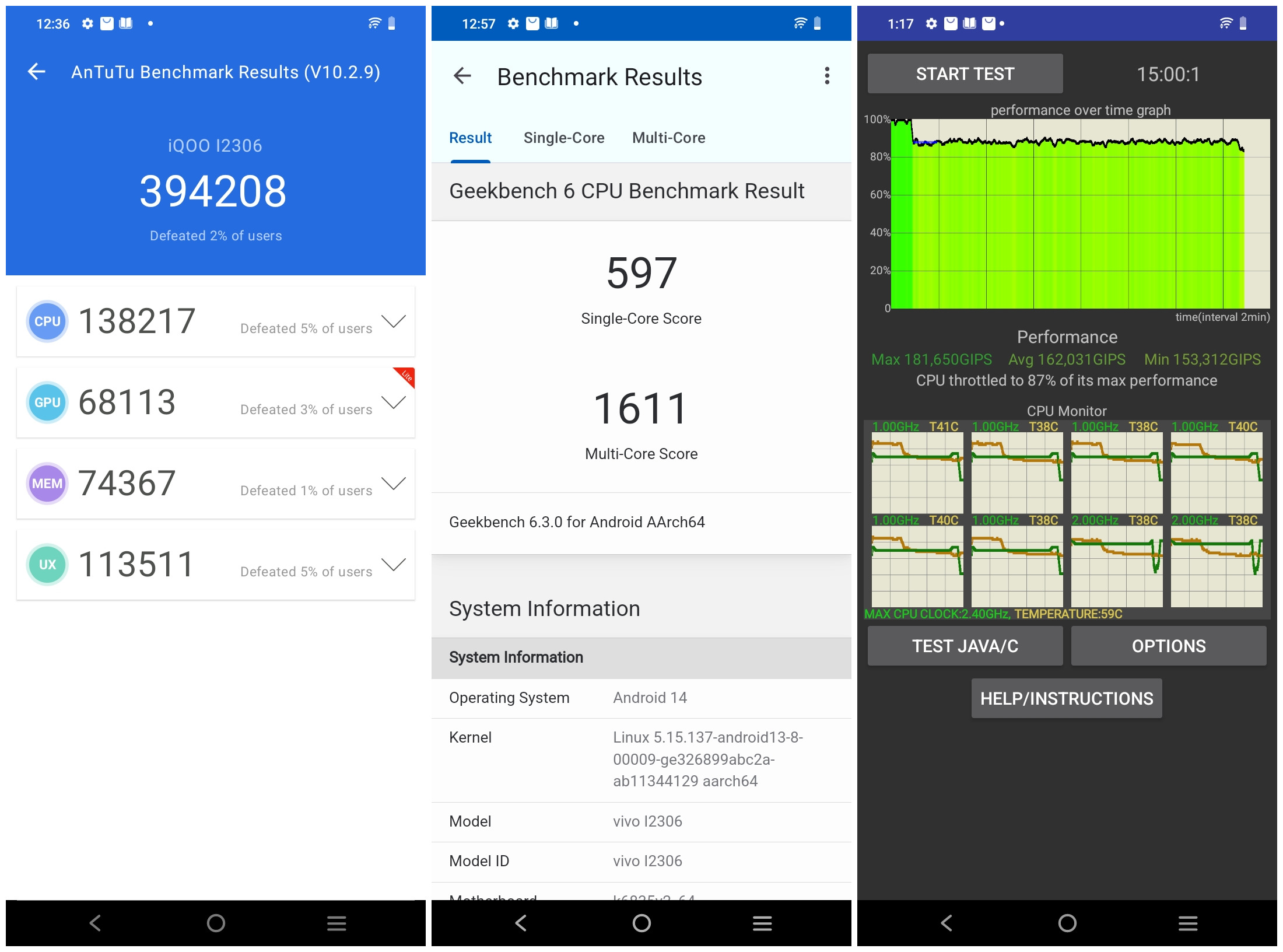 The iQOO Z9 Lite runs on the latest FunTouch OS 14 based on Android 14. It comes with some handy features, such as the App Retainer, which is useful for quickly resuming apps where I left off, and the ability to hide sensitive photos, adding an extra layer of privacy. It is good to know that Z9 Lite owners will receive Android upgrades for two years and security updates for three years. Shown above is how the device performs on different benchmarking apps.