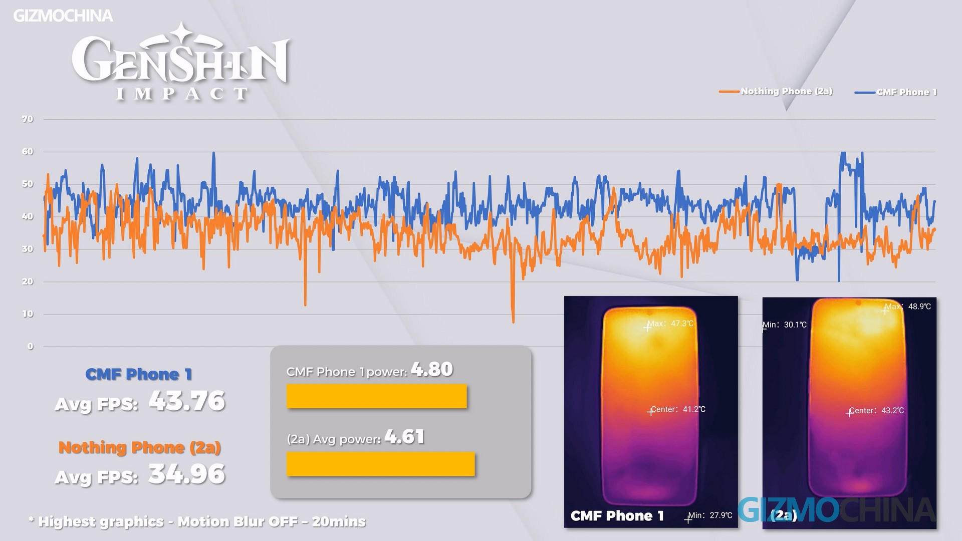 Surprisingly, the CMF Phone actually outperformed its big brother, the Nothing Phone (2a), in the gaming test session. Perhaps thanks to a more aggressive strategy, the CMF Phone’s average frame rate was much higher. It still has overheating issues at the end, but it’s pretty awesome for a budget phone to be able to do that. What we need to do is lower the graphics or limit the frame rate to 30, the gaming experience will be a bit better. For example, by lowering the graphics on the Zenless Zero to medium, the smoothness is already similar to many flagships.