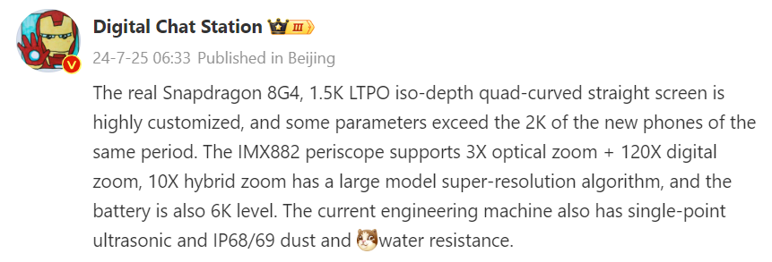 The leak also mentions that the current engineering prototype of the device has a single-point ultrasonic in-screen fingerprint sensor and IP68/69 standards for dust and water resistance.
