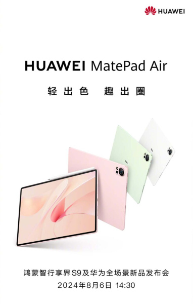 Huawei, on the other hand, teased the MatePad Air in all its four colors: White, Green, Sakura Pink, and Rose Gold. Its design appears to be quite different from the previous generation, featuring a horizontal lens setup similar to the Nova 12 Ultra on the back.