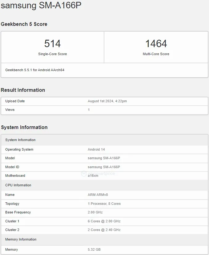 The Samsung Galaxy A16 5G is listed with model number SM-A166P on Geekbench. The database mentions a motherboard codenamed a16xm. It comprises of six cores clocked at 2GHz and two cores ticking at 2.40GHz. This suggests that the smartphone will be powered by a MediaTek Dimensity 6300 processor. It is listed with 6GB RAM onboard and we can expect more options at launch. The device will ship with Android 14 OS out of the box.
