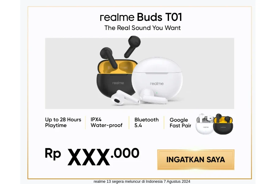 Additionally, the launch event will also see the unveiling of the Realme Buds T01 earphones for the Indonesian market. These earbuds are IPX4 splash-proof, offer up to 28 hours of playtime, connect via Bluetooth 5.4, and support Google Fast Pair.