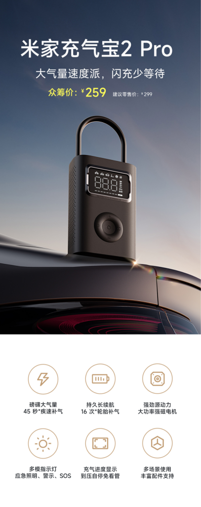 In addition to its core functions, the Mijia Inflator 2 Pro incorporates a bright LED light with SOS and flashing modes for emergency use. The product is currently available for crowdfunding on Xiaomi Youpin, with a suggested retail price of 299 yuan and a crowdfunding price of 259 yuan.