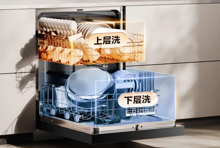 The dishwasher adopts Midea’s patented universal 720° vertical spray technology, with widened spray arms up and down to fully wrap the cavity for spraying. The spray has a water pressure of 50KPa, which can reportedly clean heard to reach areas of dishware without an issue.