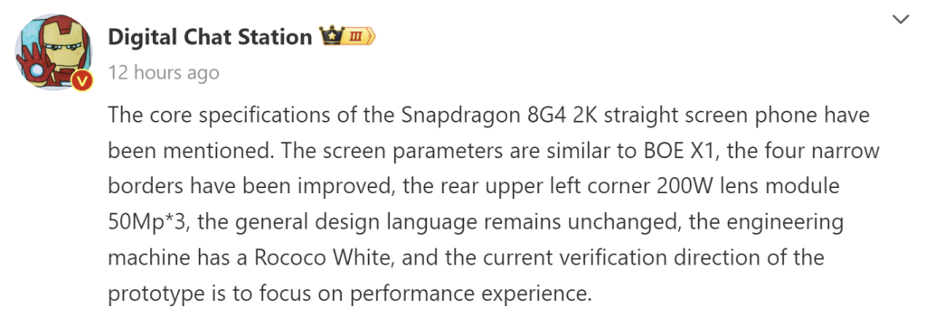 DCS noted that the camera module will be similar to Xiaomi’s newly redesigned logo, indicating that the iQOO 13 will likely keep the squircle camera island design seen in the iQOO 12. The device’s overall design is expected to remain largely unchanged, with the addition of a new “Rococo White” color option for the engineering prototype. The primary focus during the prototype testing phase is on optimizing and enhancing the device’s performance capabilities.