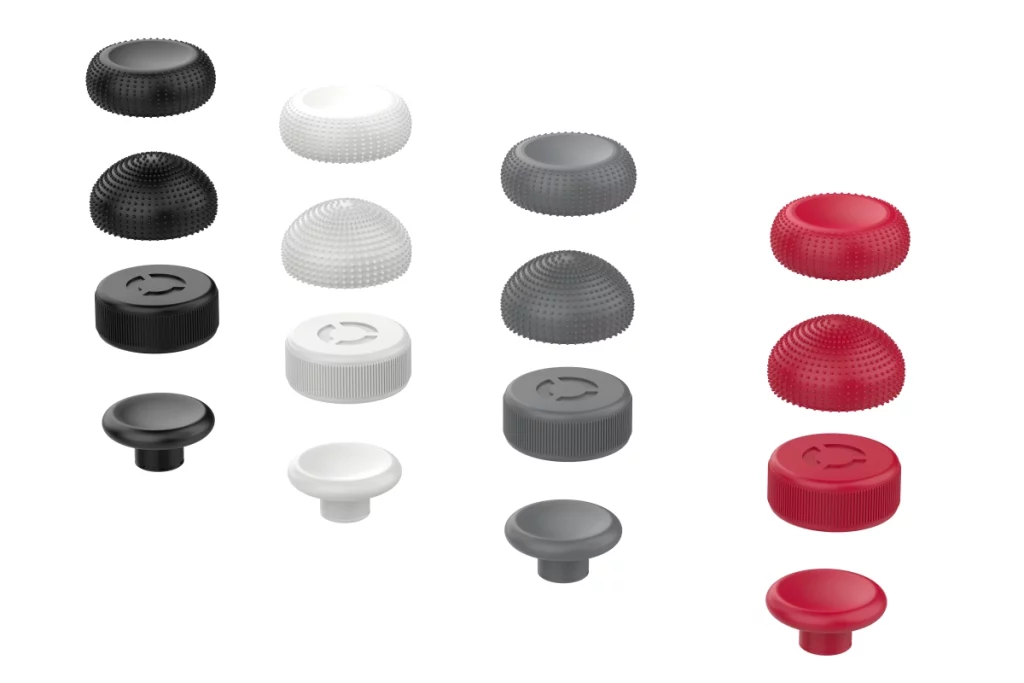 The set includes replacement joysticks and joystick caps in three shapes: spherical, concave, and cylindrical. Each of them includes a pair of products in four colors: Eclipse Black, Glacier White, Luna Grey, and Lenovo Red.