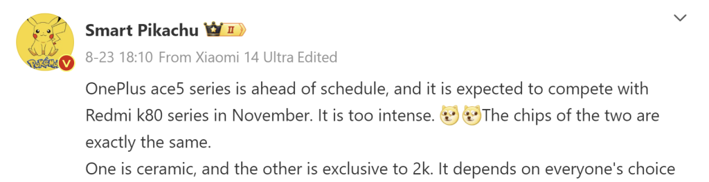 Previous reports have claimed that the OnePlus Ace 5 series will debut in the fourth quarter of this year. Now, tipster Smart Pikachu claims that the Ace 5 lineup will be announced in November to take on the Redmi K80 lineup.