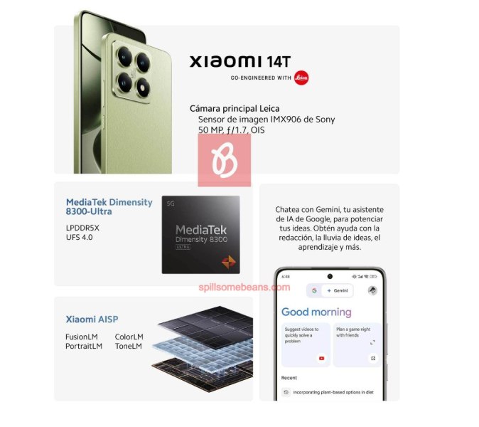 The leaked promo material further details the phone’s hardware. The Xiaomi 14T appears to be powered by the MediaTek Dimensity 8300 Ultra chipset.