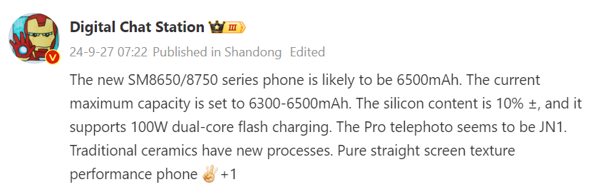 In the above-shown Weibo post, DCS is seen talking about the upcoming Snapdragon 8 Gen 4 (SM8750) and Snapdragon 8 Gen 3 (SM8650) phones from OnePlus. These are believed to be the upcoming OnePlus Ace 5 Pro and Ace 5 smartphones. The leak states that both smartphones are likely to feature a 6500mAh battery, with the maximum capacity currently set between 6,300-6,500mAh and a silicon content of around 10%±.