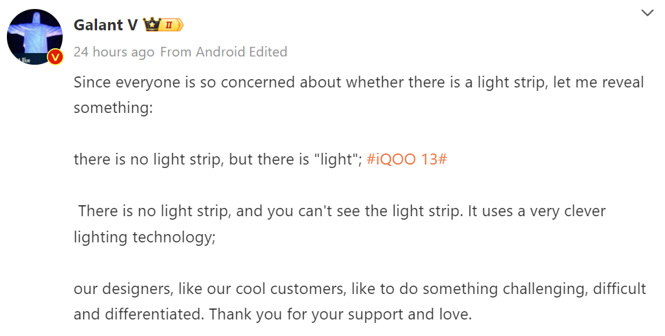 Recent images of the iQOO 13 hint at the possibility of a halo light strip surrounding the camera island. However, an iQOO exec, Galant V, who has been consistently spilling details about the iQOO 13, has claimed that the device does not include visible light strips but instead utilizes a very ingenious lighting technology. He added that designs at iQOO, much like our fans, enjoy taking on challenges and creating unique, differentiated features.