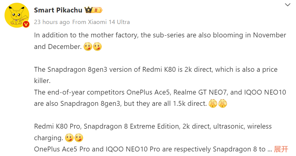 According to the tipster, the Redmi K80 with the Snapdragon 8 Gen 3 chip features a 2K flat OLED display and is expected to be a price killer. Competitors such as the OnePlus Ace 5, Realme GT Neo 7, and iQOO Neo 10 are also equipped with the Snapdragon 8 Gen 3 and feature OLED panels that offer a resolution of 1.5K.
