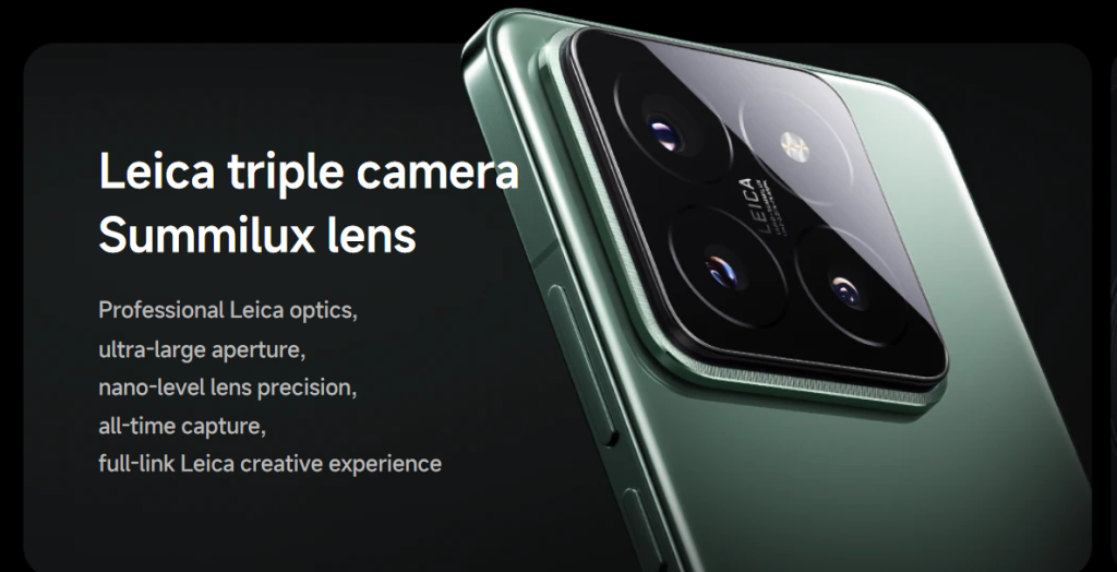 The Xiaomi 14 Pro also boasts a triple-camera system, including a 50 MP wide-angle lens with variable aperture, a 50 MP telephoto lens with 3.2x optical zoom, and a 50 MP ultrawide sensor. It features Leica optics and advanced video recording options, including 8K at 24fps, 4K at up to 60fps, and gyro-EIS.
