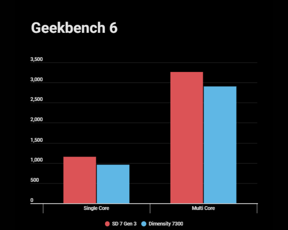 Snapdragon 7 Gen 3 also dominates Geekbench compared to Dimensity 7300, though the difference isn’t as significant as in AnTuTu benchmarks. That’s because both benchmarks perform different series of tests and have their own ways of calculating results. However, in all likelihood, the Snapdragon chip wins, at least on these benchmarks.