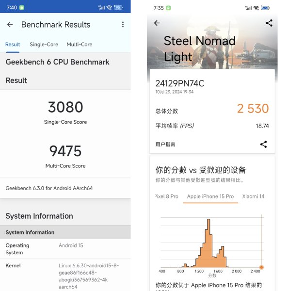 In the Geekbench 6 benchmark, the Xiaomi 15 scored 3080 points in single-core tests and 9475 in multi-core tests. In 3DMark’s Steel Nomad Light test, it achieves 2530 points with an average frame rate of 18.74.
