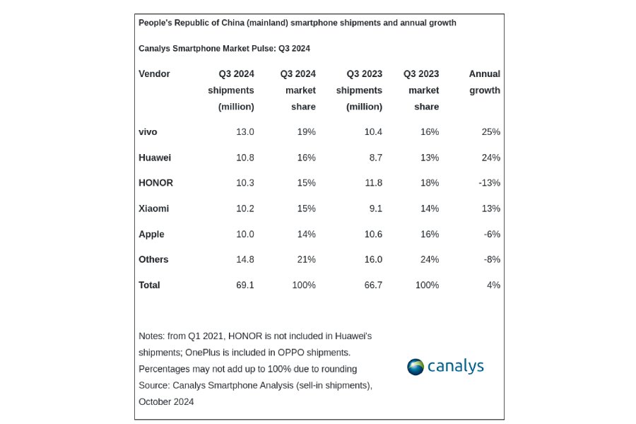 The summer shopping season in China proved fruitful for the smartphone market as the shipments rose by 4% year-over-year to 69.1 million units in Q3 2024, according to a report from Canalys.