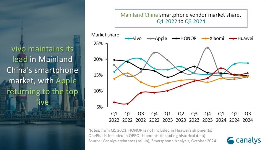 Vivo remains the leader in smartphone shipments yet again for Q3 2024, with a 3% growth from last quarter. Cnalays attributed this growth to the mid-range products launches that boosted both online and offline sales. Its shipments climbed 25% year-on-year to 13 million units to capture a solid 19% market share.