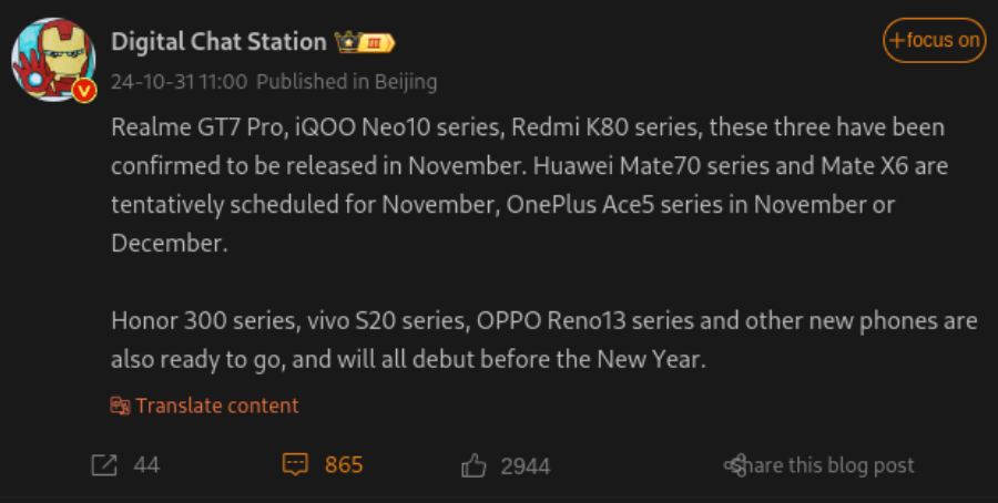 The tipster suggests that November will bring the Realme GT 7 Pro, the iQOO Neo 10 series (including the Neo 10 and Neo 10 Pro), and the Redmi K80 series (with both K80 and K80 Pro variants). Notably, Realme has already confirmed the GT 7 Pro launch for November 4, 2024.