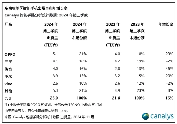 The Southeast Asian smartphone market experienced notable growth in Q3 2024, with shipments increasing by 15% year-on-year, reaching a total of 25 million units, according to a recent report by Canalys. This growth reflects the region’s recovery and increased demand across various smartphone segments. Oppo emerged as the market leader, with other prominent brands like Samsung, Transsion, Xiaomi, and vivo following closely.