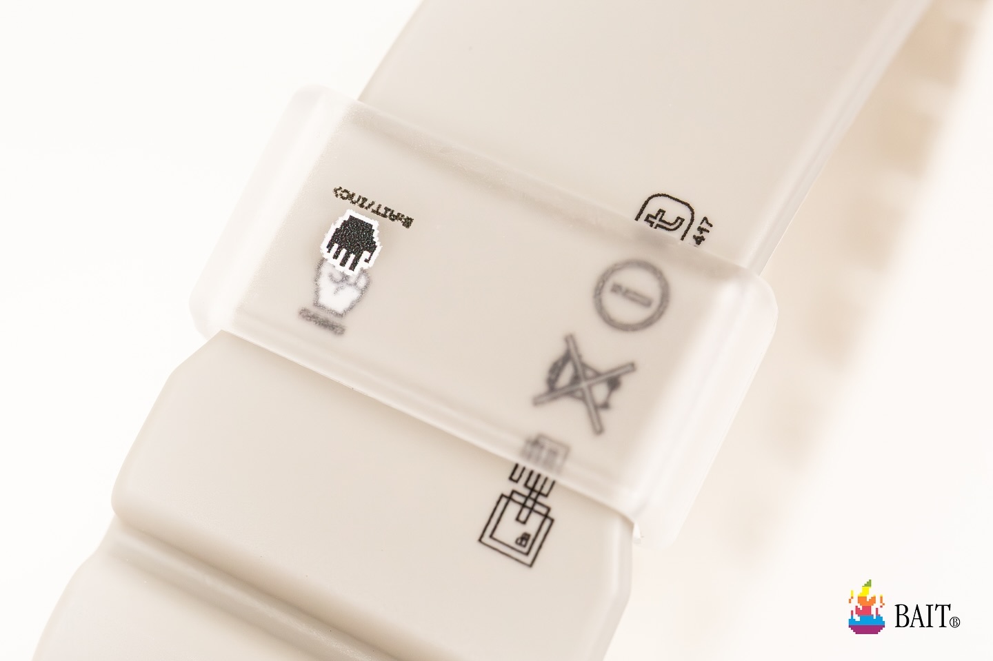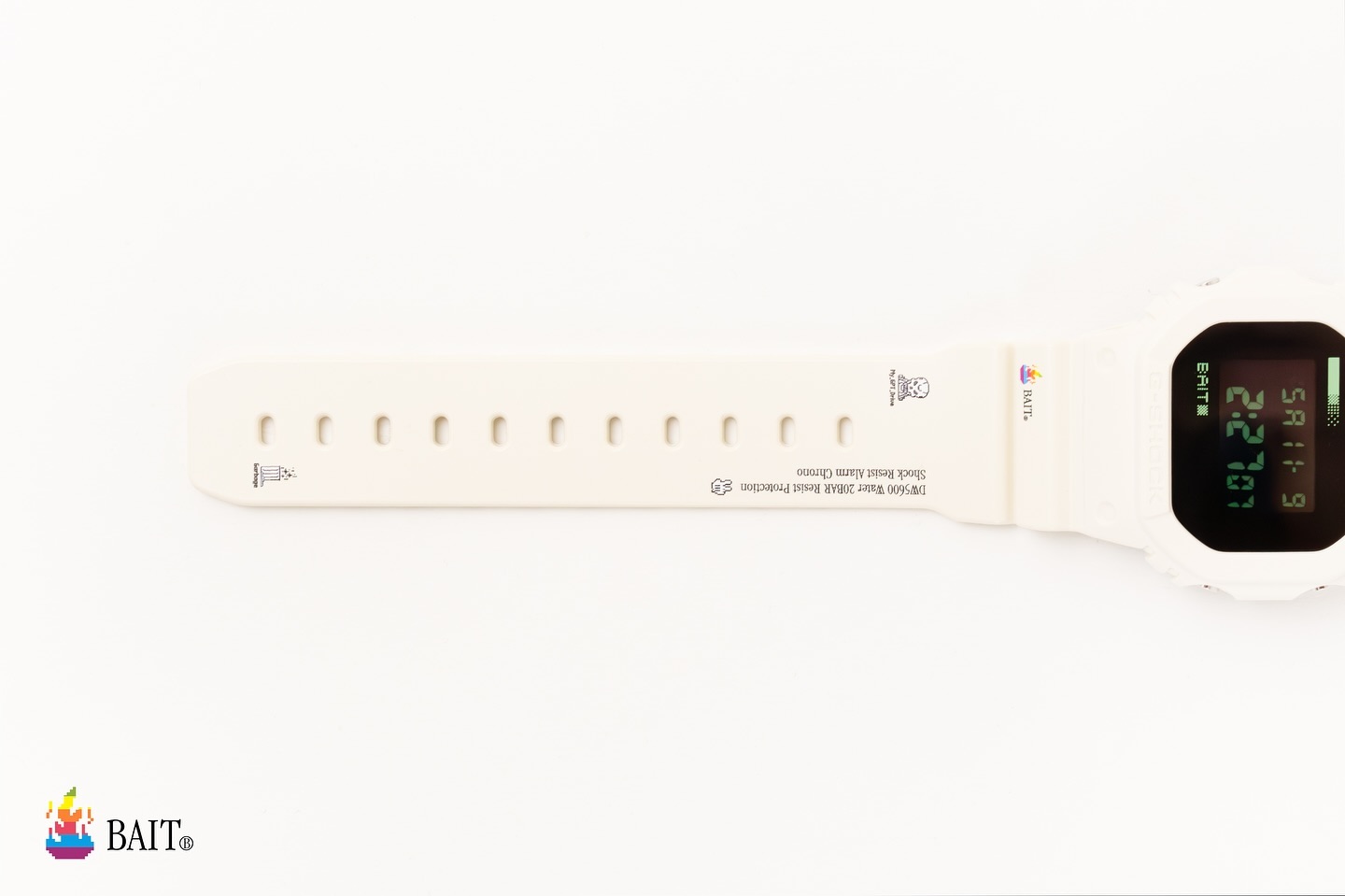 The Bait x Casio G-Shock DW5600 showcases a bold white resin case, strap, and octagonal bezel. Its design takes inspiration from Apple’s 80s branding, featuring a rainbow-striped flame icon and a matching font on the band. The dial includes glow-in-the-dark accents around the green negative LCD, offering better visibility in low light and adding a nostalgic retro touch.