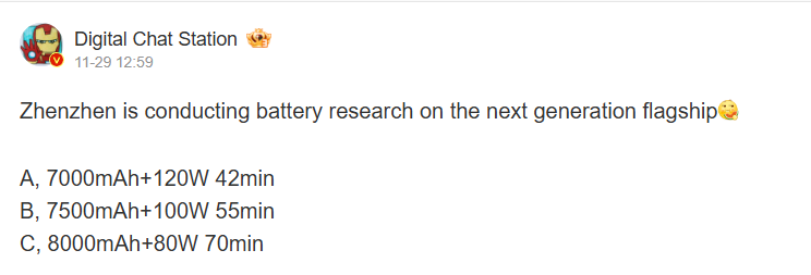 Finally, a 7,000mAh battery with 120W charging is also being considered. This option would provide significant battery life while maintaining relatively fast charging speeds, with charging times estimated to be around 42 minutes.