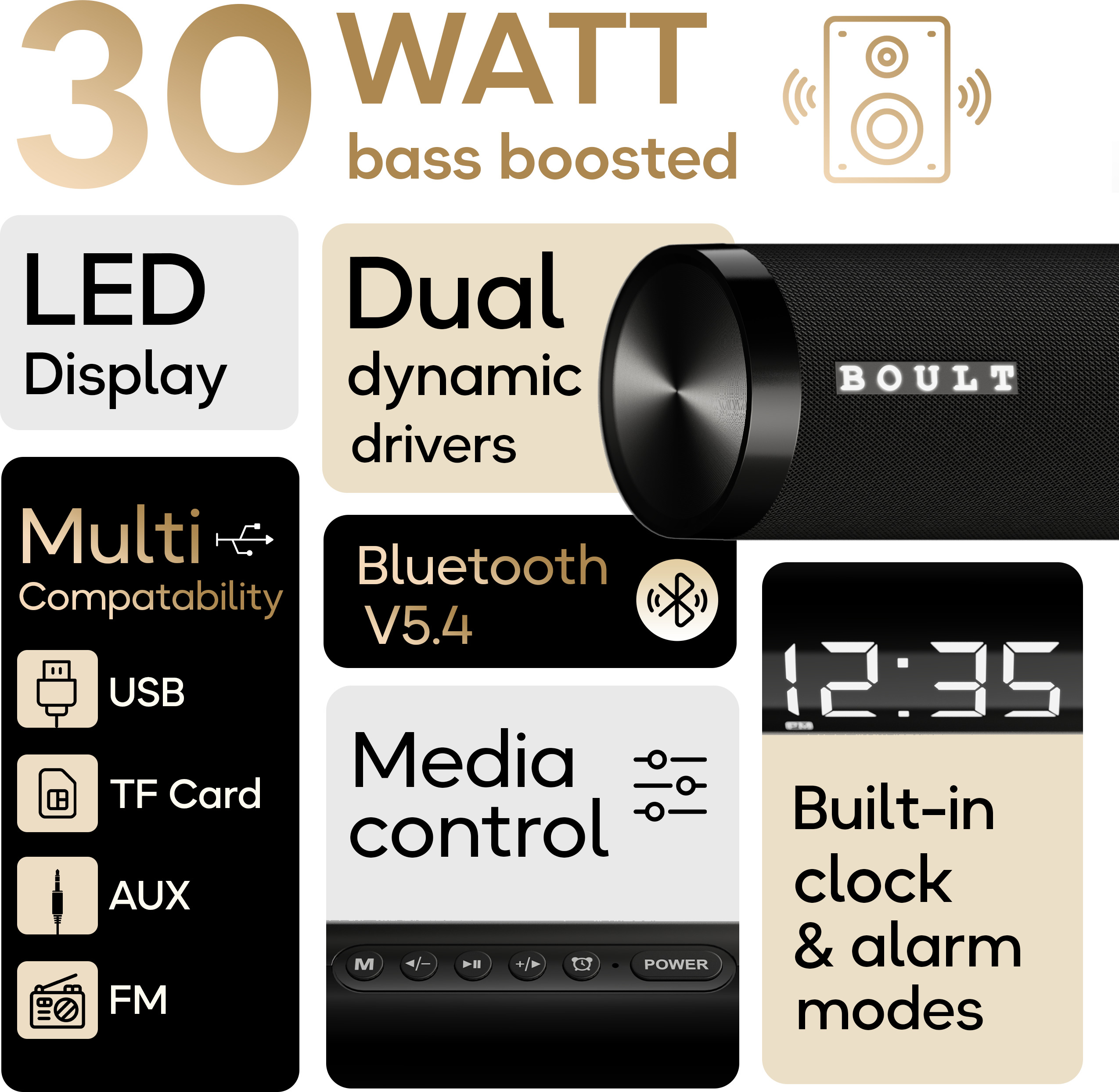 For just Rs. 1,799, the Bassbox X30 packs a punch with its 30W output and enhanced bass. Its compact design is perfect for music, movies, and gaming, delivering immersive sound through dual dynamic drivers. It supports Bluetooth 5.4, FM, AUX, USB, and TF card connectivity. It even has a built-in clock and alarm, full media controls, and compatibility with smart devices and projectors.